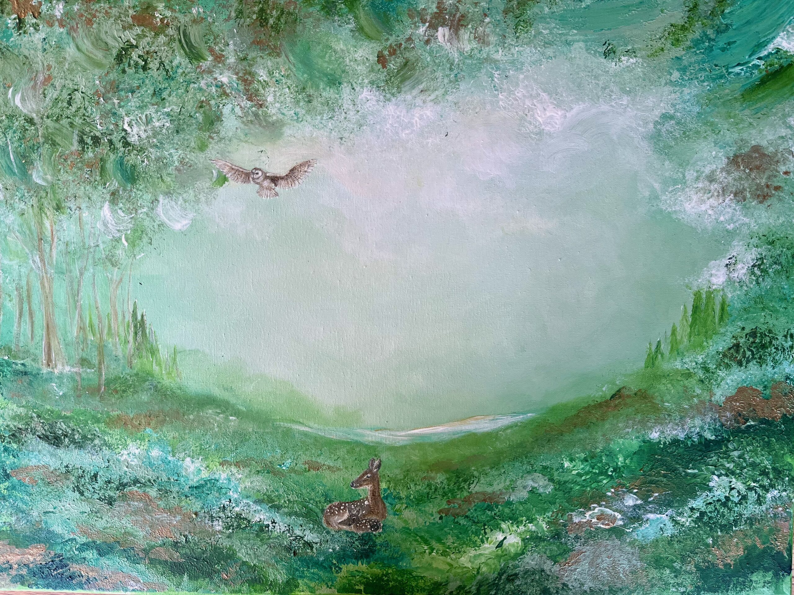 This tranquil woodland scene invites the viewer into a sanctuary of stillness and gentle wonder. Bathed in soft, misty light, the forest opens to a quiet clearing where a young deer rests upon the lush ground, embodying innocence and calm. Above, an owl soars gracefully, its wings outstretched as guardian of the serene glade. The interplay of textured greens and soft whites evokes a dreamlike atmosphere, where earth and sky meet in hushed harmony. A painting that whispers of peace, protection, and the timeless balance of nature.